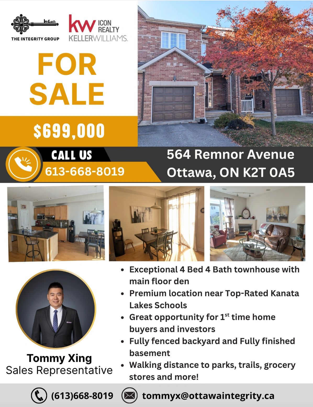 4 Bed + Office, 4 Bath Townhome in Kanata Lakes